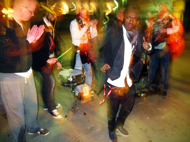 Tämä ei ole kunniaksi toimittajille, hän oli kaasusussa kuin käki. Eikä ottanut yhtään vaaria, siitä että hallilla rummutetaan (kuva). Kapakka se oli se juttu. Niin se oli minullekkin. Vaikka siellä soi jääkiekkomusiikki. Mutta minulla oli parempi tekosyy. Minulla ei ollut paikkaa vielä missä nukkua.