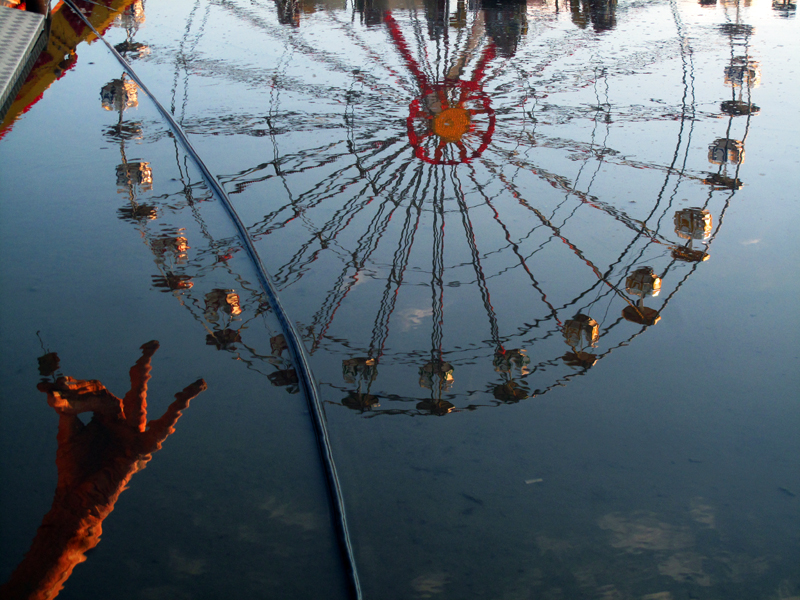 Kokkola häämöttää iltauringon takana. Pari päivää kasausta, viisi päivää tivolia ja purku ja siirtyminen Ouluun. Ei taida tulla kaupunki tutuksi tässä ajassa.