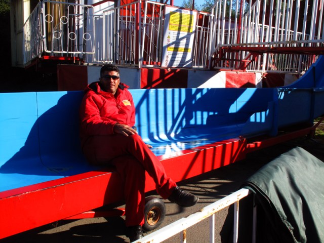 Pääseen sitten hypyttäämään teinejä ihan kunnolla. Eräät pyysivät päästä laitteeseen ilmaiseksi, joka tietenkin edellyttää että maailmanpyörältä käydään hakemassa protirasvaa. No, maailmanpyörä lähetti teinit toimistoon, jossa heille kuulemma naurettiin kovasti. Itse sain kuulla kusettamis syytöksiä. Pitäähän sitä nyt kentän toiseen laitaa juosta, jos haluaa ilmaiseksi laitteeseen. Ja tietenkin tulisi olla sitä protirasvaa mukana.