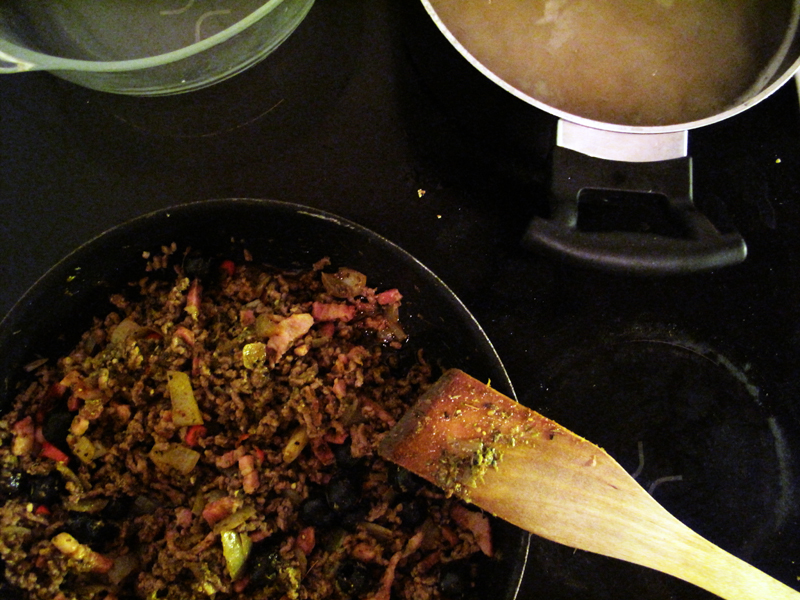 400g jauhelihaa, 125 g pekonia, silputtua, iso keltasipuli