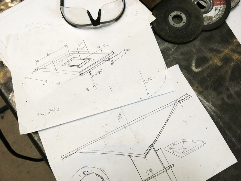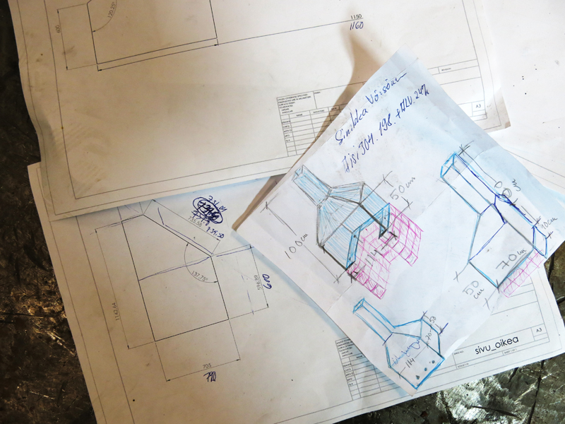 Kuvassa piirustukset, jotka piti kuvastaa hiekansirotinta. Mutta sittemmin paljastui, että tämähän on ahjo, joka rakennetaan Sepän pajalle, Vanhalle asemalle. Silloin minä otin homman haltuun. Koska Paja ja tutut.