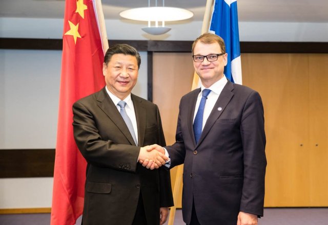 Valtioneuvoston valokuvaaja olisi voinut vähän sommitella vaikka mallejen avulla kuvauskohdan etukäteen, niin että kun se sekunnin kädenpuristus kuvan aika on, niin ei olisi lipputangot kasvamassa päästä, eikä kattolamppu kuvan pääkohteena.