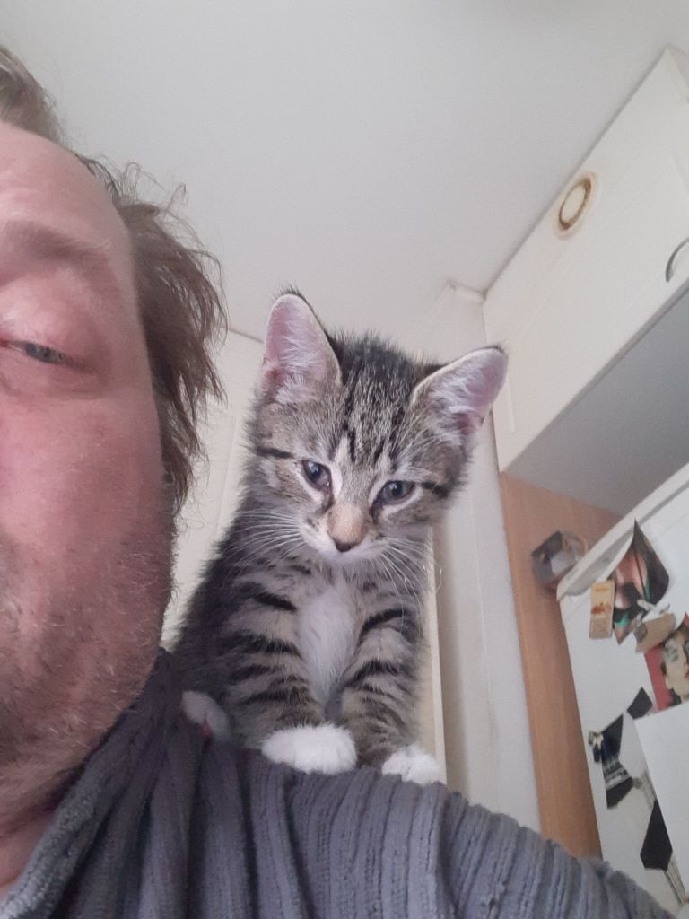 Pieni kissa riittää olkapäälle maailman tuskaksi