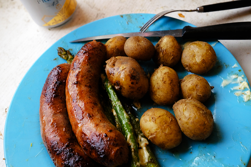 Ei riittänyt kolmen sekunnin sääntö. Kissa suihkuun virkistäytymään, että saa syödä makkarat ja uudet potut rauhassa.
