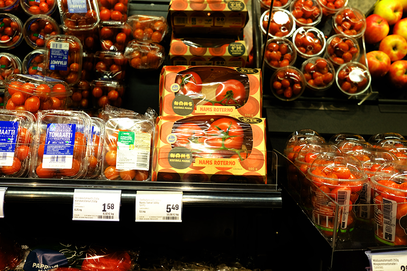 Kalliin puoleiset tomaatit, näin talvella. Kasvihuoneessa kasvatetut kotimaiset. 11 euroa kilo, reilu 2 euroa per tomaatti.